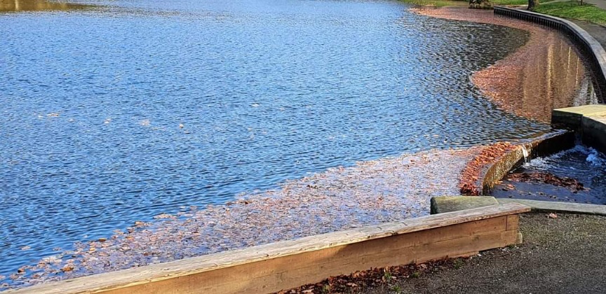 På billederne fra søen kan man se, at den kraftige blæst har presset blade over mod den ene bred.